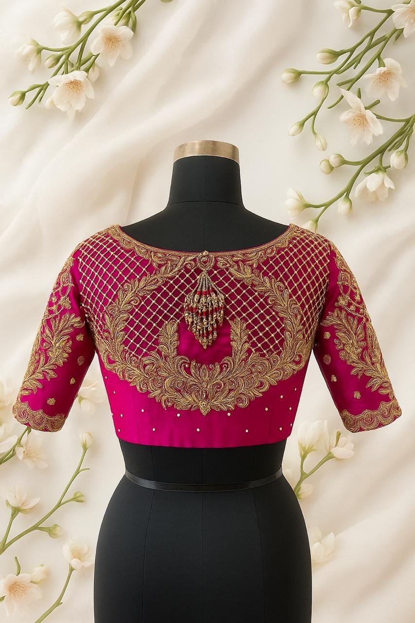Handcrafted bridal blouses with Aari embroidery for a rich, royal look on your big day.